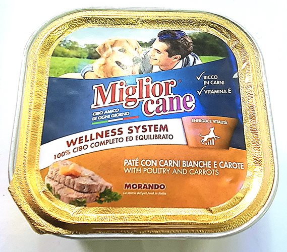 Morando. מזון מלא שימורים לכלב. פטה בטעם בשר לבן וגזר 150 גר'. תוצרת איטליה.