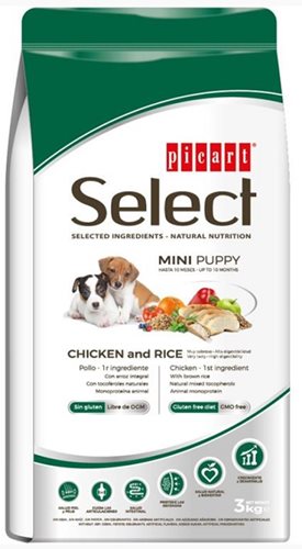 אוכל לכלבים "סלקט מיני" של חברת ®Picart הספרדית מותאם בצורה מיטבית לצרכיהם של כלבים מגזע קטן, ומאופיין בערך תזונתי גבוה וויטמינים ומינרלים המסייעים בשמירה על השיניים, הלב, המפרקים, העור והפרווה. המרכיבים הייחודיים תורמים לשמירה על מצבם הפיזי והחיוניות של כלבים מגזע קטן.