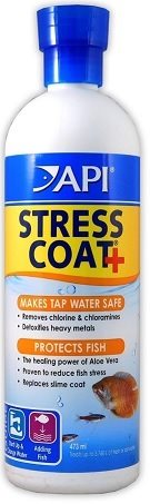 סטרס קוט + הינו מוצר אשר מסיר כלורין, כלורמין ומתכות כבדות והופך את מי הברז למים בטוחים עבור דגים, תוצרת ארה"ב.