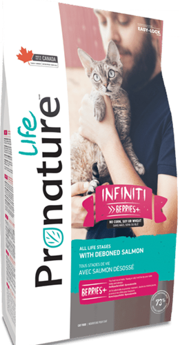 Pronature Infiniti הוא מזון איכותי תוצרת קנדה המתאים לכל שלבי חיי החתול, החל מגור שרק נולד ועד לחיים בוגרים. רכיבים: עוף, אפונה, שיבולת שועל (סיבים תזונתיים), סלק, סלמון נקי מעצמות, נבטי אלפלפה, מיקס פירות יער, תמצית רוזמרין.